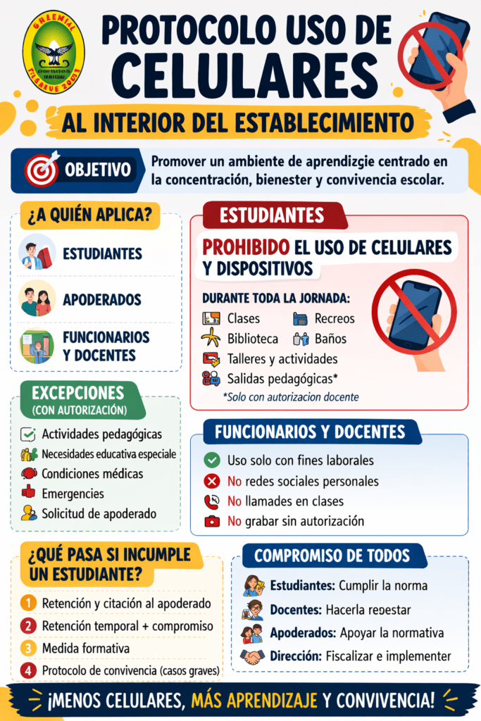 En nuestro colegio creemos en espacios donde todos puedan aprender, concentrarse y convivir mejor. Por eso, te invitamos a conocer y ser parte de este nuevo protocolo de uso de celulares 📱